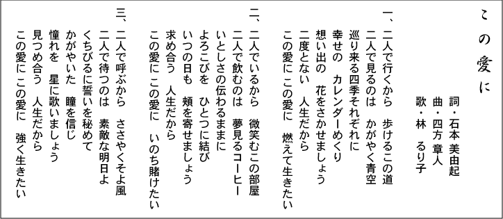 上記番組のイメージソングとして、エンディングで2006年10月放送開始から、隔週で『この愛に』が3ヶ月間放映されました。